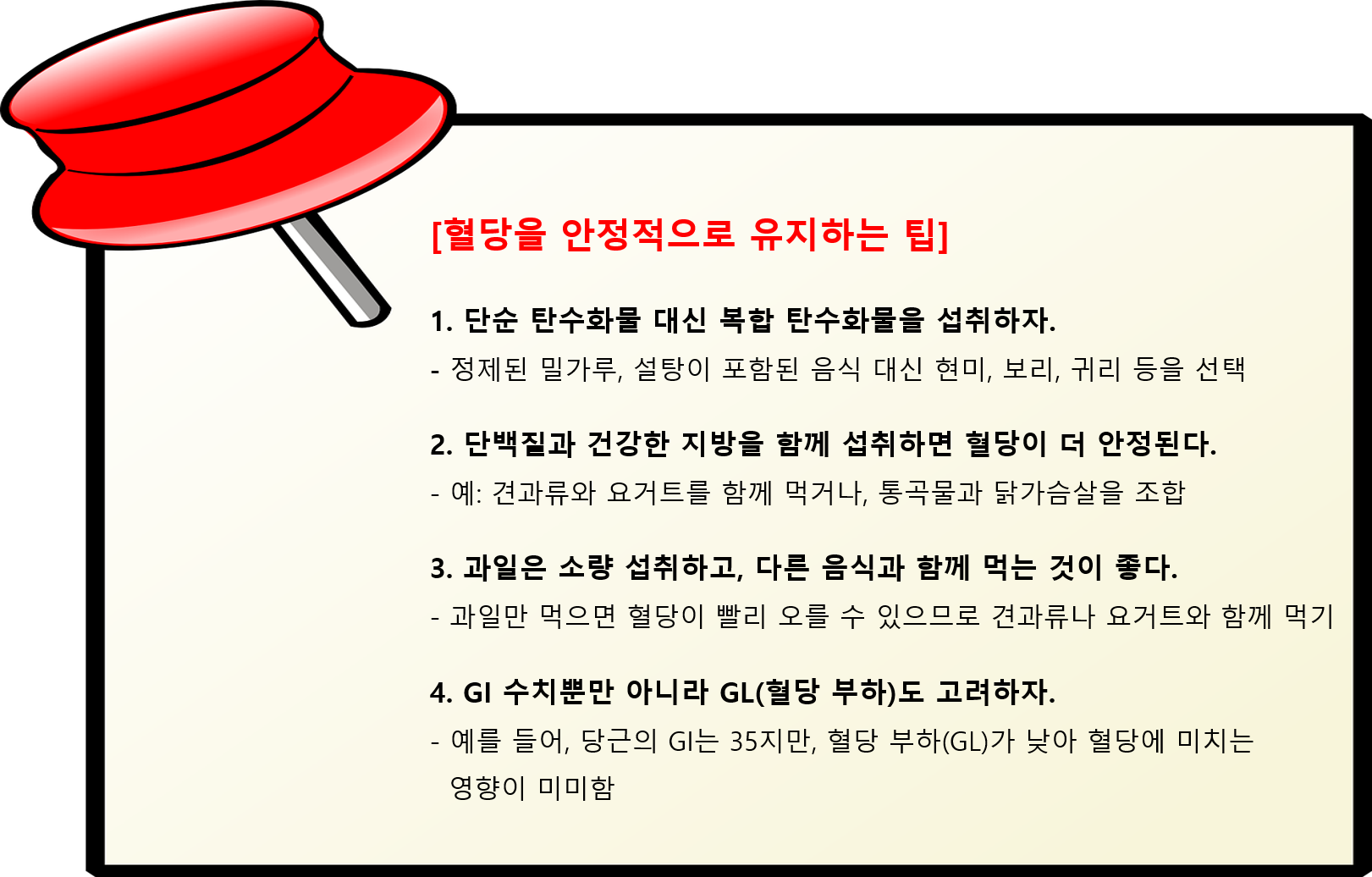 ▼당뇨병 관리를 위해서는 혈당을 천천히 올리는 낮은 GI(Glycemic Index, 혈당지수) 식품을 섭취하는 것이 중요하다. GI는 음식이 혈당을 올리는 속도를 측정하는 지표로, GI 55 이하의 음식은 낮은 GI 식품으로 분류되며 혈당을 서서히 올려 인슐린 저항성을 개선하는 데 도움을 준다.