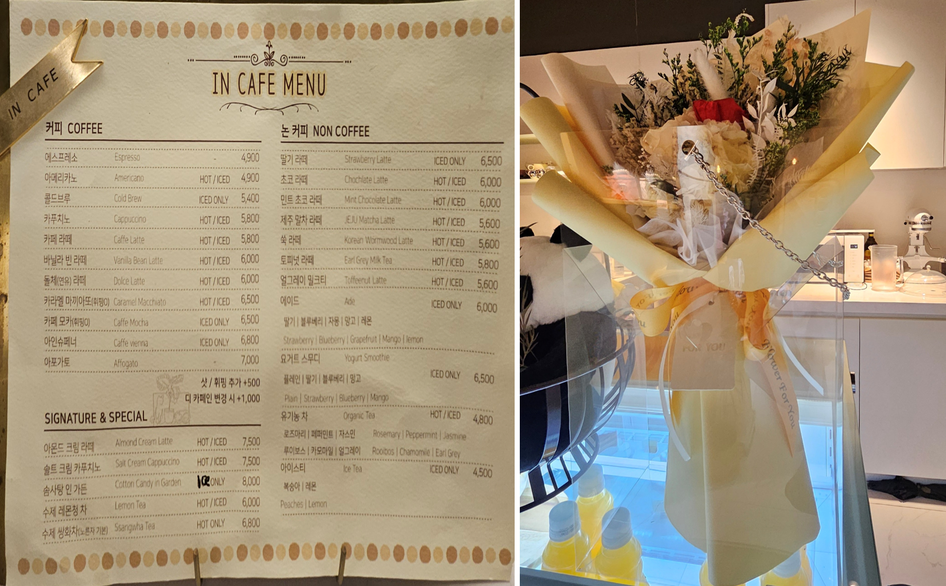 어울리는 화려한 꽃들이 카페 내부에 진열되어 있어요.